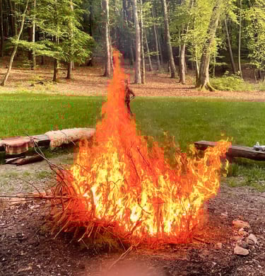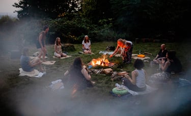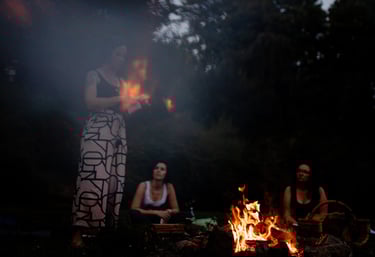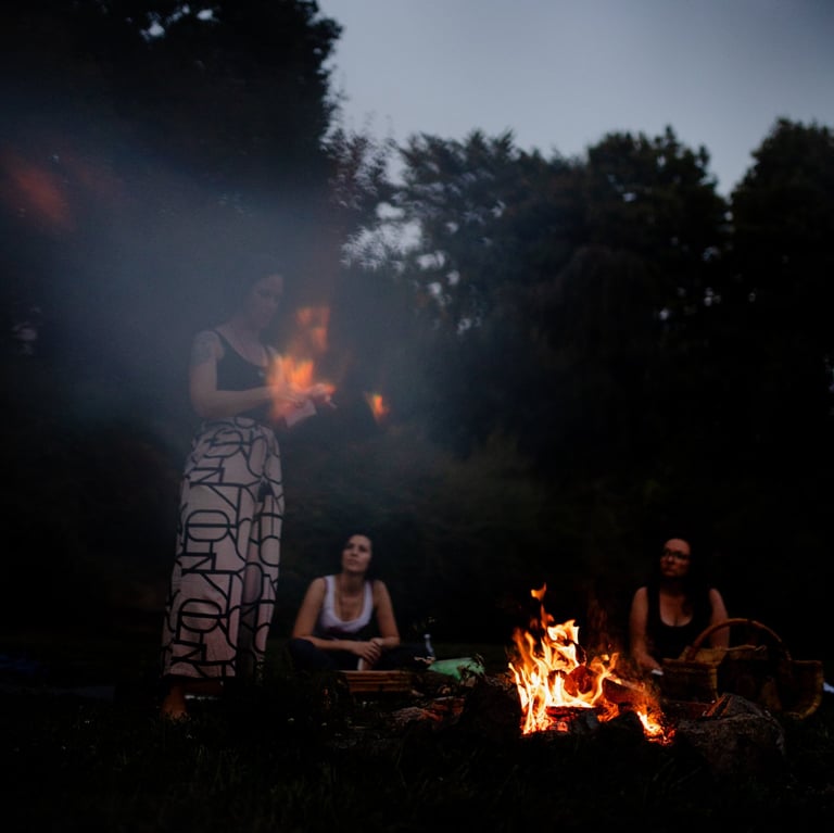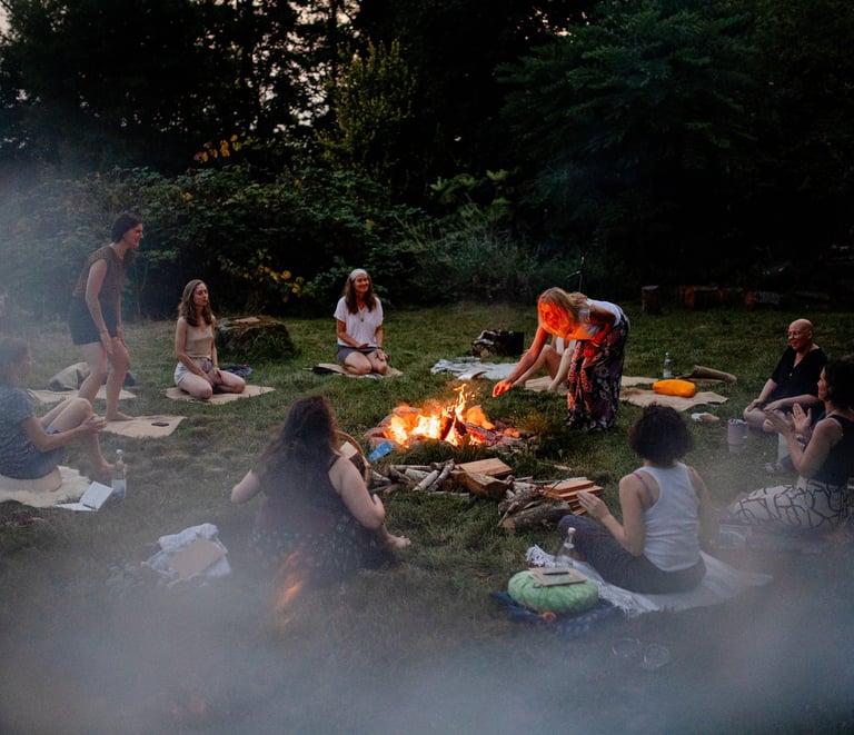 Imagine a group of creative visionary women dancing with their shadows around the fire surrounded by a bamboo forest.